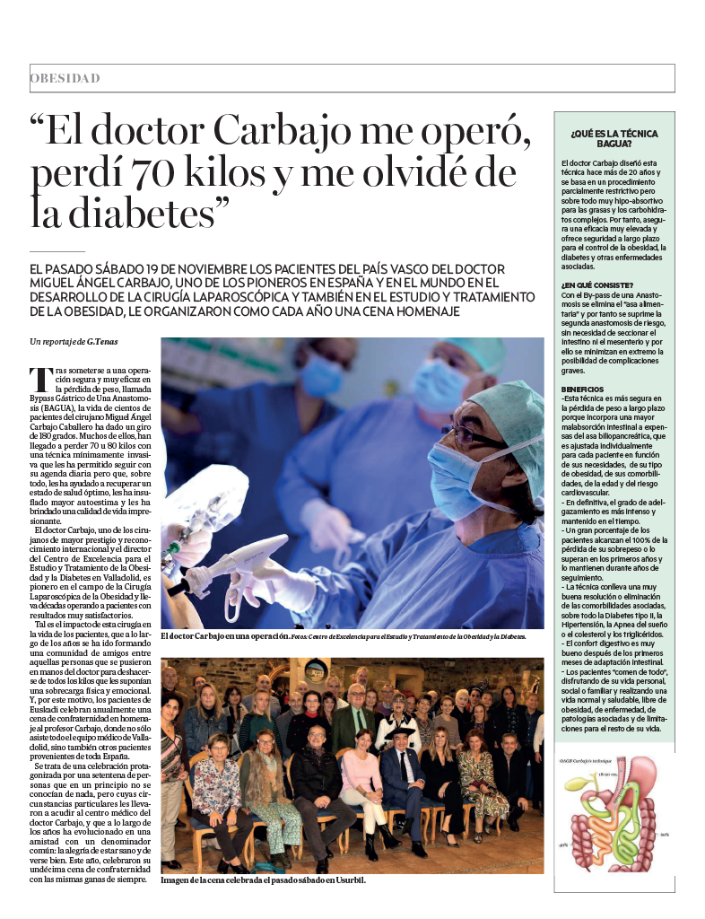 El sábado 19 de noviembre de 2022, los pacientes del País Vasco del Doctor Miguel Ángel Carbajo, uno de los pioneros en España y en el mundo en el desarrollo de la cirugía laparoscópica y también en el estudio y tratamiento de la obesidad, le organizan como cada año una cena homenaje.
